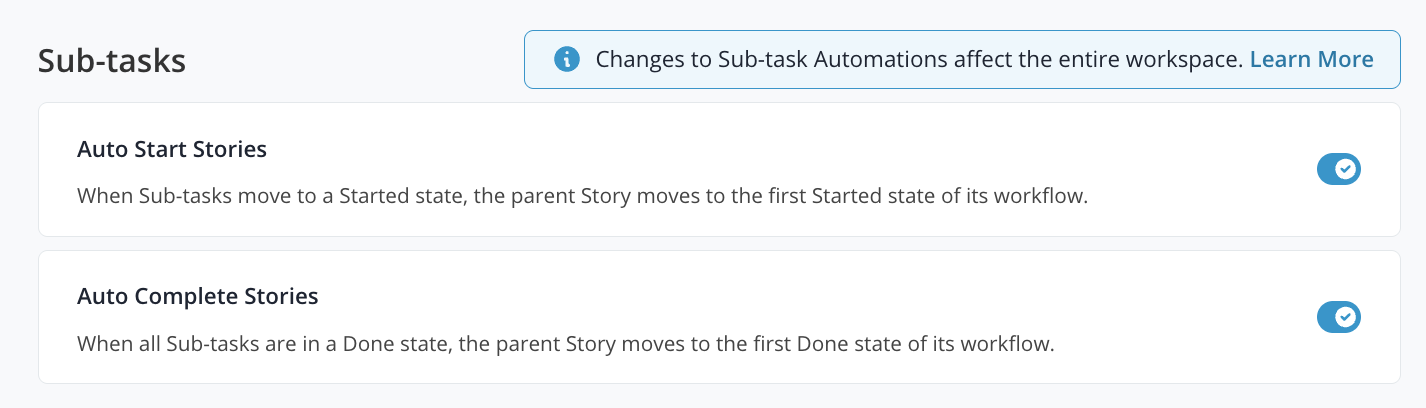 When this automation is enabled, any time a Sub-task is moved into a "Started" state, the parent Story will automatically transition to the first "Started" state in its assigned workflow. This ensures that Story progress reflects the activity happening at the Sub-task level, helping teams maintain accurate visibility without needing to update both items manually.