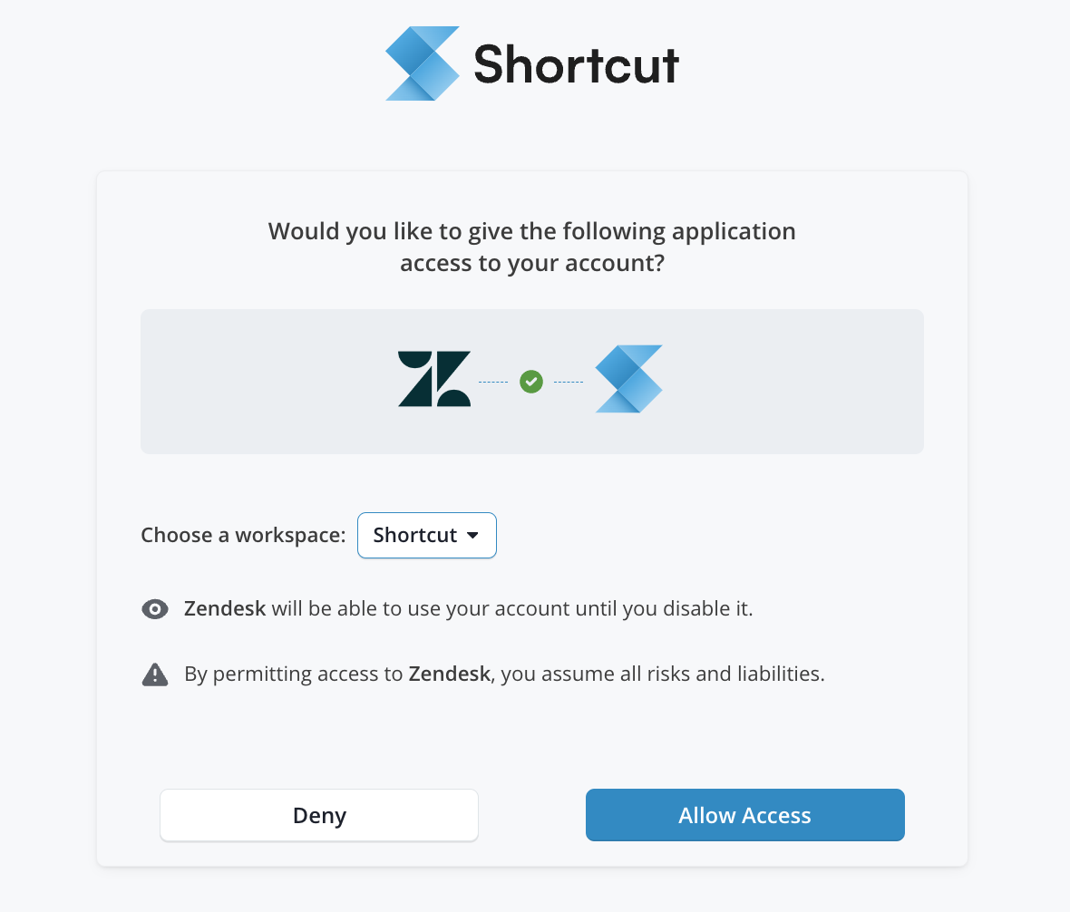 The "Authorize" flow will open a new page where you will select the Shortcut Workspace that Zendesk will be able to access. Once you select the Workspace, click "Allow Access".