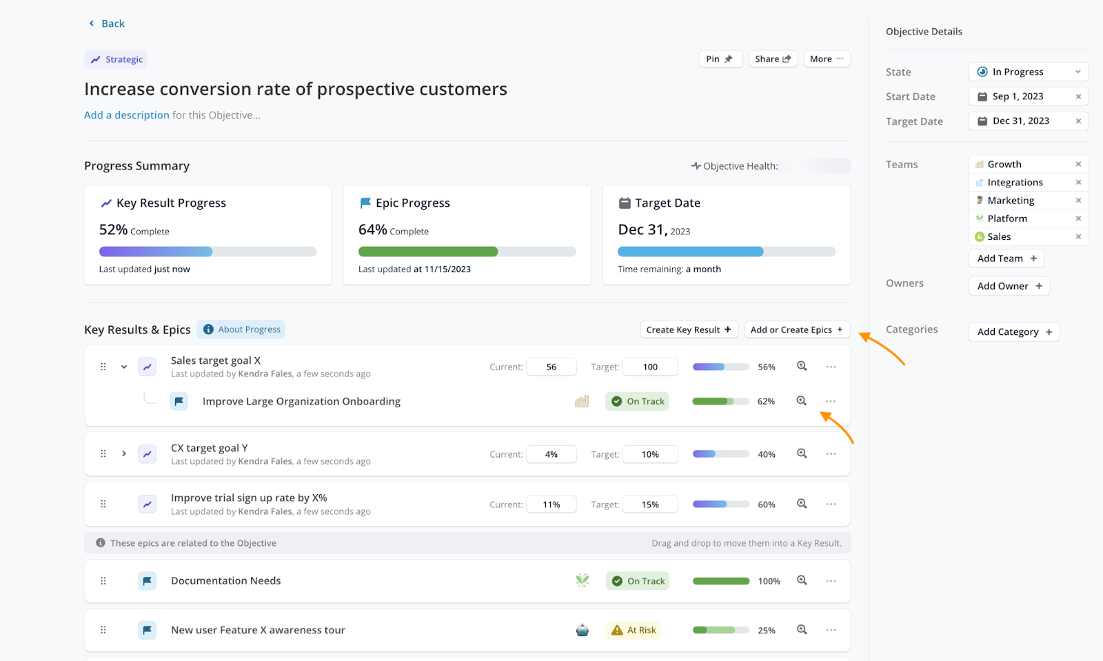 Objectives let you see progress towards your top-level strategic goals in the same place as where the product development work is happening. As Stories roll up into Epics, Epics roll up into Objectives and are the key components that drive the business forward. You can add Key Results to track the metrics that matter most.
