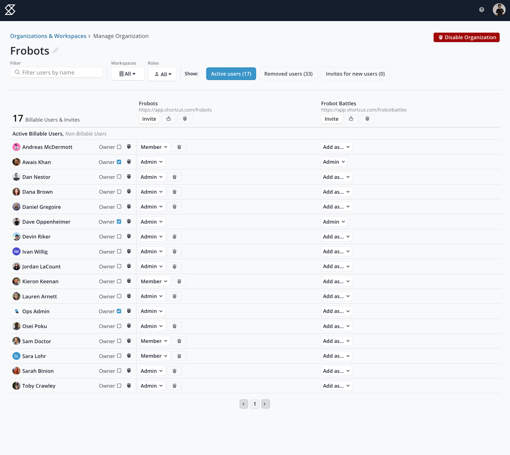 Suppose you are the Owner, or one of the Owners, of an Organization. In that case, you can manage its user membership and roles, disable its Workspaces, see the number of billable users and invitations, and perform other administrative tasks by clicking Manage Organization and Workspace.