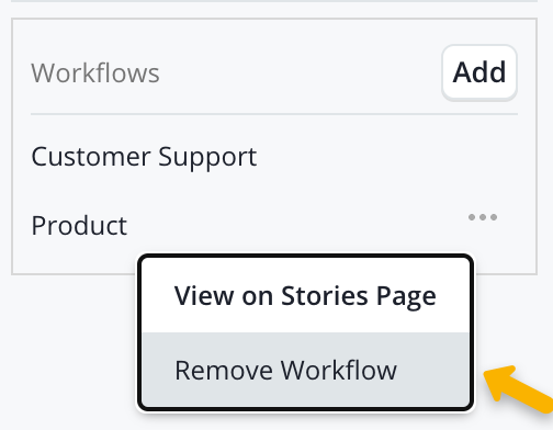 A Team must be associated with at least one Workflow. If seeking to remove a Workflow from a Team, when on the individual Team page, first associate the Team with another Workflow in the Workspace then remove the Workflow via the "More Actions" options by selecting the ellipsis symbol next to the Workflow.