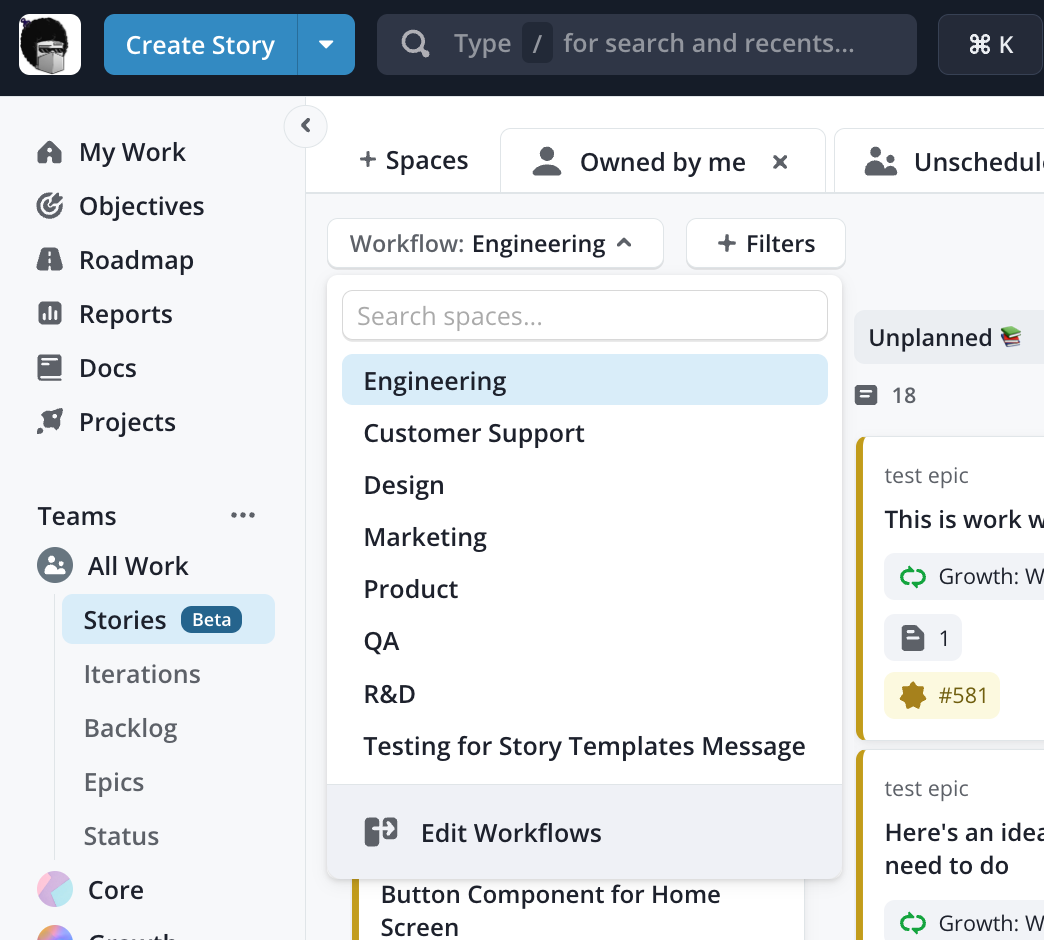 If your Workspace uses multiple Workflows, you will find a Workflow switcher at the top of the left on the Stories page.