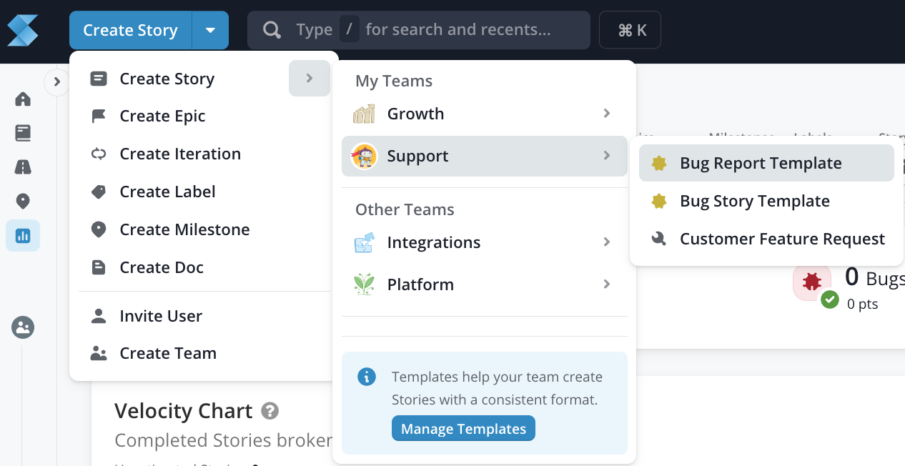Once enabled, Story Templates allow you to create Stories from a pre-formatted template, saving you and your team time and effort on commonly written Stories.
